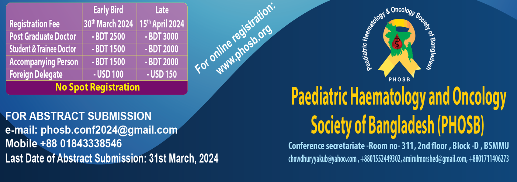 Contrary to our belief the childhood blood disorder and cancers are no less common. With the advent of modern diagnostic facilities and overall rise in consciousness the paediatric blood and oncological disorders are increasingly being managed by paediatric haematologist and oncologist. Keeping the slogan in the forefront “Scaling up care and cure for blood disorders and cancer in children” Paediatric Haematology & Oncology Society of Bangladesh (PHOSB) is going to organize its 4th International Conference on 26-27 April at Bangamata Sheikh Fazilatunnesa Mujib Convention Hall, Minto Rd, Dhaka. There will be many scientific deliberations which will help the participants to update their knowledge. You will also have the opportunity to share your knowledge & experience in this conference. More over you will have the opportunity to meet your near & dear ones at this auspicious gathering. Therefore, you are cordially invited to participate in the 4th International Conference of PHOSB and your gracious presence will make the event successful.